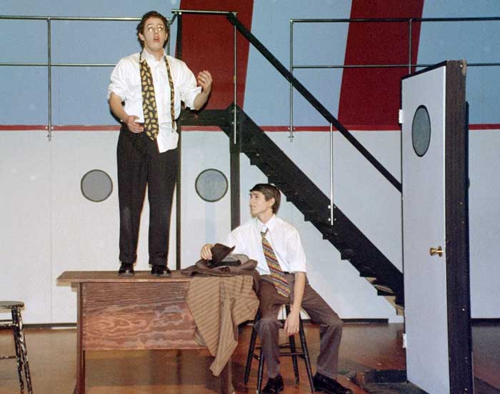 Reused set components from "Anything Goes", center door is practical, stairway was moved. We gave the basic design to an art class. Each member of the class created a model as a class project. The chosen artist got to paint the full-sized scene.
